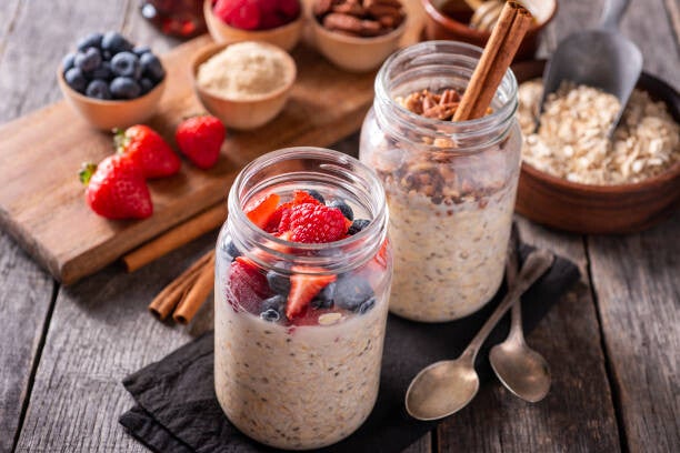 Mettre les flocons, le lait, le yaourt, les graines de chia et le miel dans un pot.